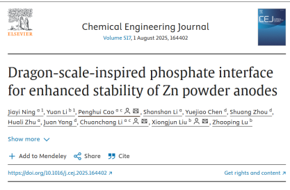 近日,XK星空能源与动力工程学院在水系锌离子电池领域取得重要突破。由曹鹏辉老师指导、该院本科生宁嘉仪为第一作者,在化学工程领域权威期刊《Chemical Engineering Journal》(中科院一区,影响因子为13.4)发表题为“Dragon-scale-inspired phosphate interface for enhanced stability of Zn powder anodes”的研究论文。该研究创新性地提出一种基于三聚磷酸钠(STPP)电解质添加剂调控策略的锌粉阳极界面工程,成功构建了“龙鳞壁”界面,为解决水系锌离子电池(AZIBs)中锌枝晶生长和界面副反应等关键难题提供了全新且高效的解决方案。