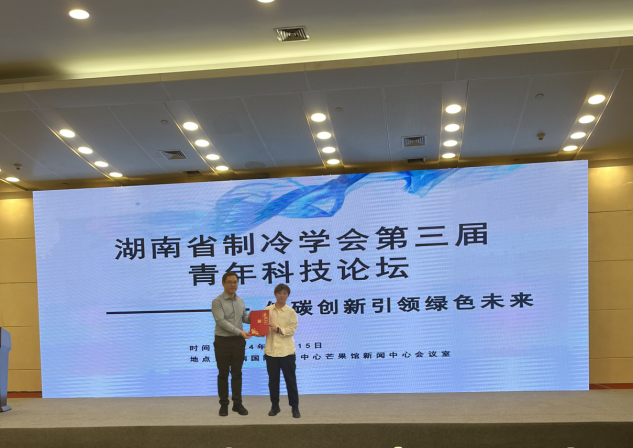 李杰老师于“2024年湖南省暖通空调制冷学术年会”分会场做了关于“相变储能性能分析及结构优化研究进展”的学术报告。研究生项思源于“低碳创新 引领绿色未来”湖南省制冷学会第三届青年科技论坛分会场做了关于“双冷源空调系统供冷性能及热舒适性对比实验研究”的学术报告。