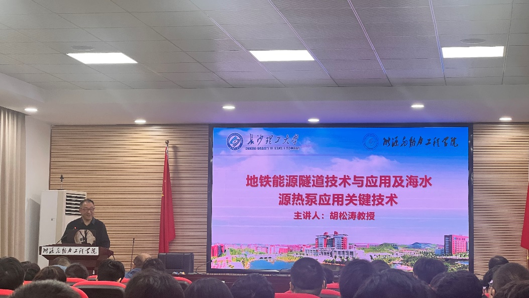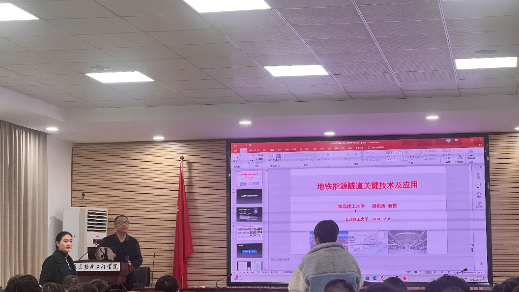 胡松涛教授发表了题为“地铁能源隧道技术与应用及海水源热泵应用关键技术”的报告。胡教授的报告分为两个部分,第一部分介绍了热泵的分类及其工作原理,展示了常见的地源热泵系统及性能计算,分析了行业痛点及难点,即地铁隧道热堆积的原因、后果和目前的解决办法,进而重点讲解了“地铁能源隧道关键技术”这项前沿技术的理论基础、技术优势和研究成果。第二部分胡教授介绍了海洋低品位热能的利用,海洋低品位热能的利用一直是海洋资源利用中的难点和痛点问题。胡教授分享了其团队在海洋低品位热能利用方面的研究成果,特别是针对复杂海岸条件下的海水源热泵应用技术。他所介绍的“海水-土壤柔性双源”前端高效换热技术及热泵系统协同设计与节能运行技术,不仅解决了技术难题,还取得了良好的经济效益,达到国际领先水平。胡教授的讲授幽默风趣、深入浅出,引人入胜之余兼具很强的学术性和前瞻性。报告结束后,我院师生积极与胡教授进行了深入的交流和讨论,现场气氛热烈,学术氛围浓厚。