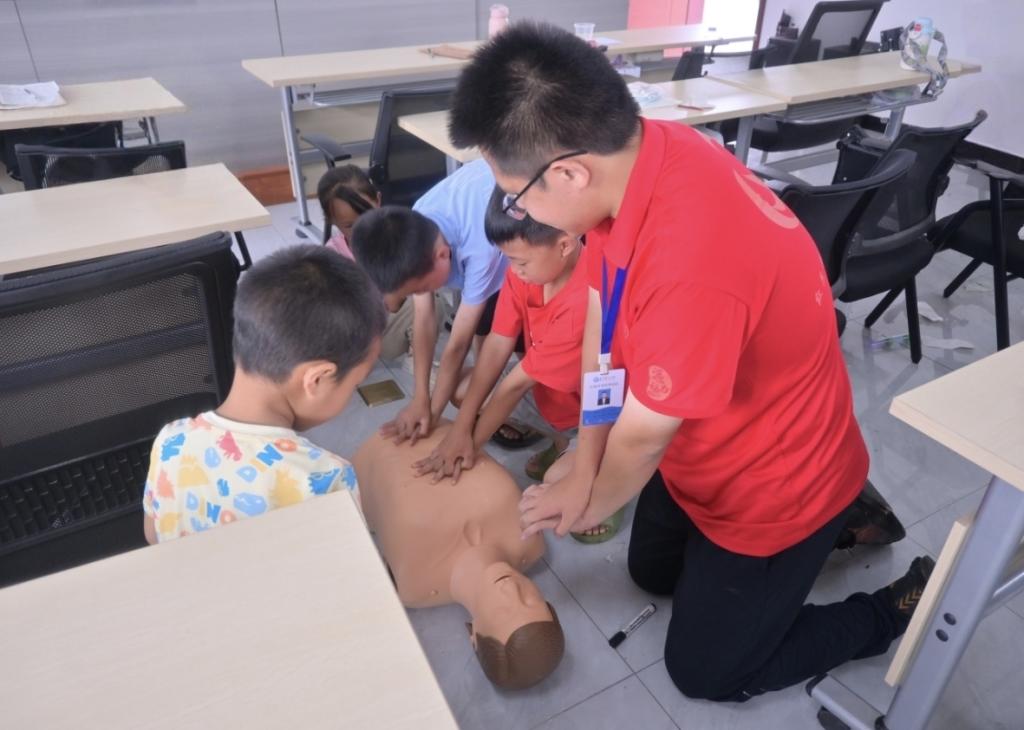 刚讲完,孩子们的目光便齐刷刷聚焦在桌上的假人模型上。“要是遇到有人晕倒、溺水昏迷,我们应该怎么办?”志愿者的问题瞬间点燃了孩子们的热情。面对各式各样的答案,队员们拿出清晰的示意图和步骤图,边讲解边在模型上同步示范,并反复强调关键点。