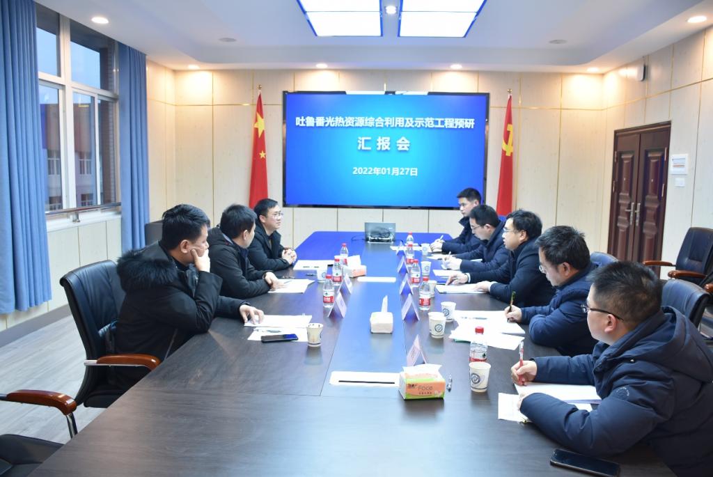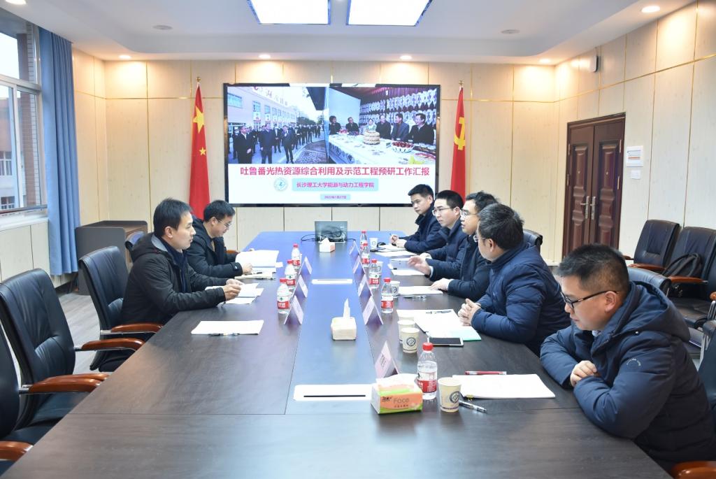 2022年1月27日下午,吐鲁番光热资源综合利用及示范工程预研汇报会在能动学院召开。湖南省援疆前方指挥部副部长、吐鲁番市委组织部副部长林亮亮,湖南省援疆前方指挥部成员、办公室主任、吐鲁番市人社局副局长刘仁色,湖南省援疆前方指挥部成员、吐鲁番市教育局副局长李进军出席会议。能动学院党委书记成华、院长陈荐、副书记兼副院长张晓烽、副院长李传常、项目组成员肖俊兵博士参会,汇报会由成华主持。
