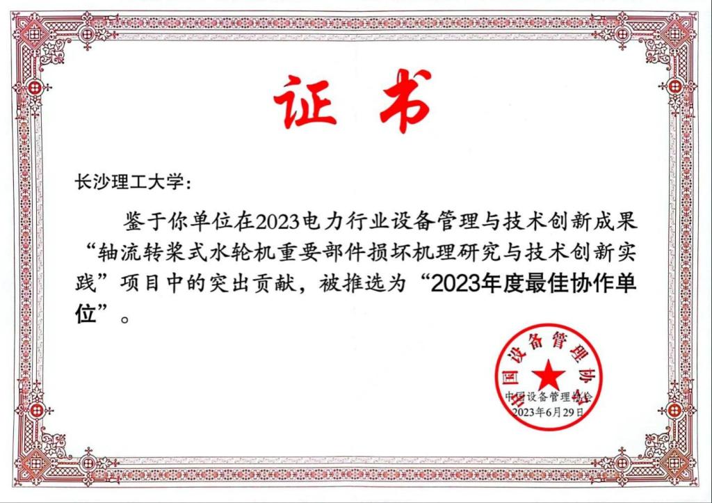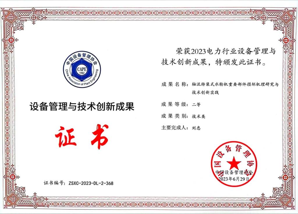 6月29日至30日,由中国设备管理协会主办的2023行业设备管理与技术创新成果交流大会在浙江省温岭市举行。贵州清水江水电有限公司挂治水力发电厂和XK星空共同完成的“轴流转桨式水轮机重要部件损坏机理研究与技术创新实践”荣获2023 电力行业设备管理与技术创新成果二等奖,XK星空被授予“最佳协作单位”。校方主要完成人、我院刘忠教授参加了此次大会。