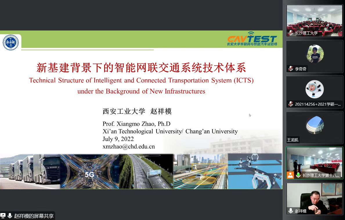 赵祥模教授做了题为《网联自动驾驶车路云网一体化架构及测评体系》的精彩报告,全方面的介绍了网联化自动驾驶系统车路云网体系的总体建设思路与总体构架。该体系由感知与控制层、通信层、计算层、数据层、服务员应用层以及展示层组成。对于该体系的研究包含了多个关键技术,分别是:基于车路协同的智慧交通全要素泛在感知、多模式车路协同高精度定位技术、网联化自动驾驶典型交通场景和构建、基于与平台的全息信息融合及协同服务、多模式异构通信网络部署融合与优化、信息交互与安全关键技术等等。最后,赵祥模教授介绍了他的研究团队所做的研究工作。自主研发了多型号、多系列的自动驾驶汽车,还研发了国内外首套自动驾驶室内测试平台,完成了基于虚拟现实技术的智能汽车测试场景及其数据构建。这将为各类交通参与者提供大量全局、实时和先验信息,同时辅助自动驾驶汽车环境惑知和即时通信,消除行车安全和交通拥堵隐患,使得道路交通系统更加安全、高效、环保和舒适。