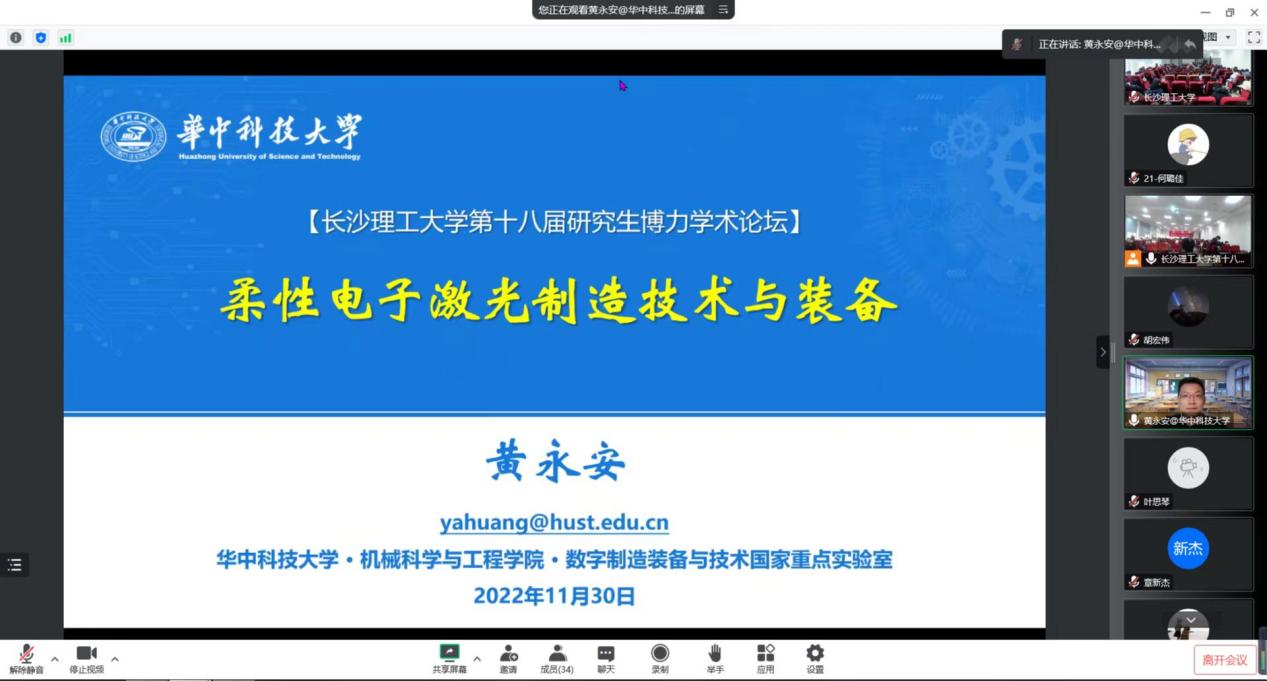 2022年11月30日9:40,华中科技大学教授、博士生导师,数字制造装备与技术国家重点实验室副主任、国家杰青黄永安教授受汽机学院邀请做客XK星空第十八届研究生博力学术论坛“智能车辆与智造前沿”专题论坛。本次报告由汽机学院副院长胡林主持,副院长毛聪、副院长尹来容、章杰、罗源嫱、王丹琦等教师及部分研究生参加了本次报告。
