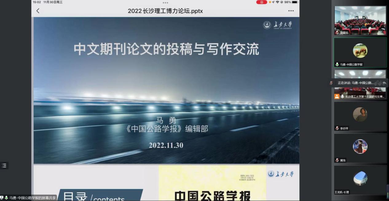 2022年11月30日15:10,中国公路学报》编辑部副主任,副编审,“人-车系统安全理论与技术”教育部创新团队骨干研究成员马勇受汽机学院邀请做客XK星空第十八届研究生博力学术论坛“智能车辆与智造前沿”专题论坛。本次报告由汽机学院副院长胡林主持,副院长毛聪、副院长尹来容、章杰、罗源嫱、王丹琦等教师及部分研究生参加了本次报告。