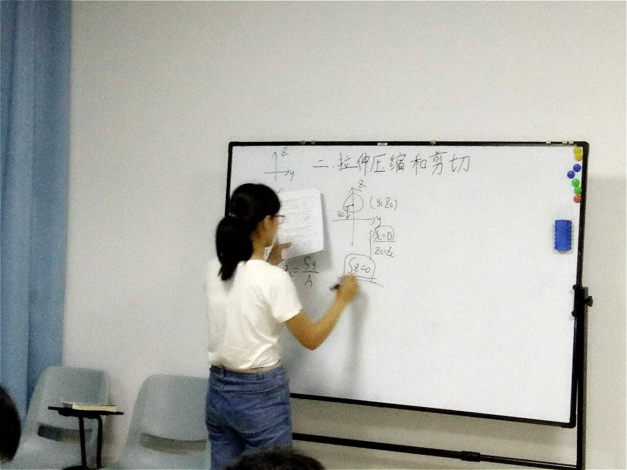 课堂伊始,辅导员周路路老师鼓励了讲课的同学,也表扬了听课的同学。在课堂期间,刘鹏辉同学为我们讲解了第二章,关于拉伸,剪切,挤压的有关知识以及习题。汤子艺同学为大家讲解了第三章和附录一,关于扭转和平面的图形的几何性质。课堂上大家都很积极与主讲人进行习题互动,整个课堂的氛围很好,大家都在其中受益匪浅。