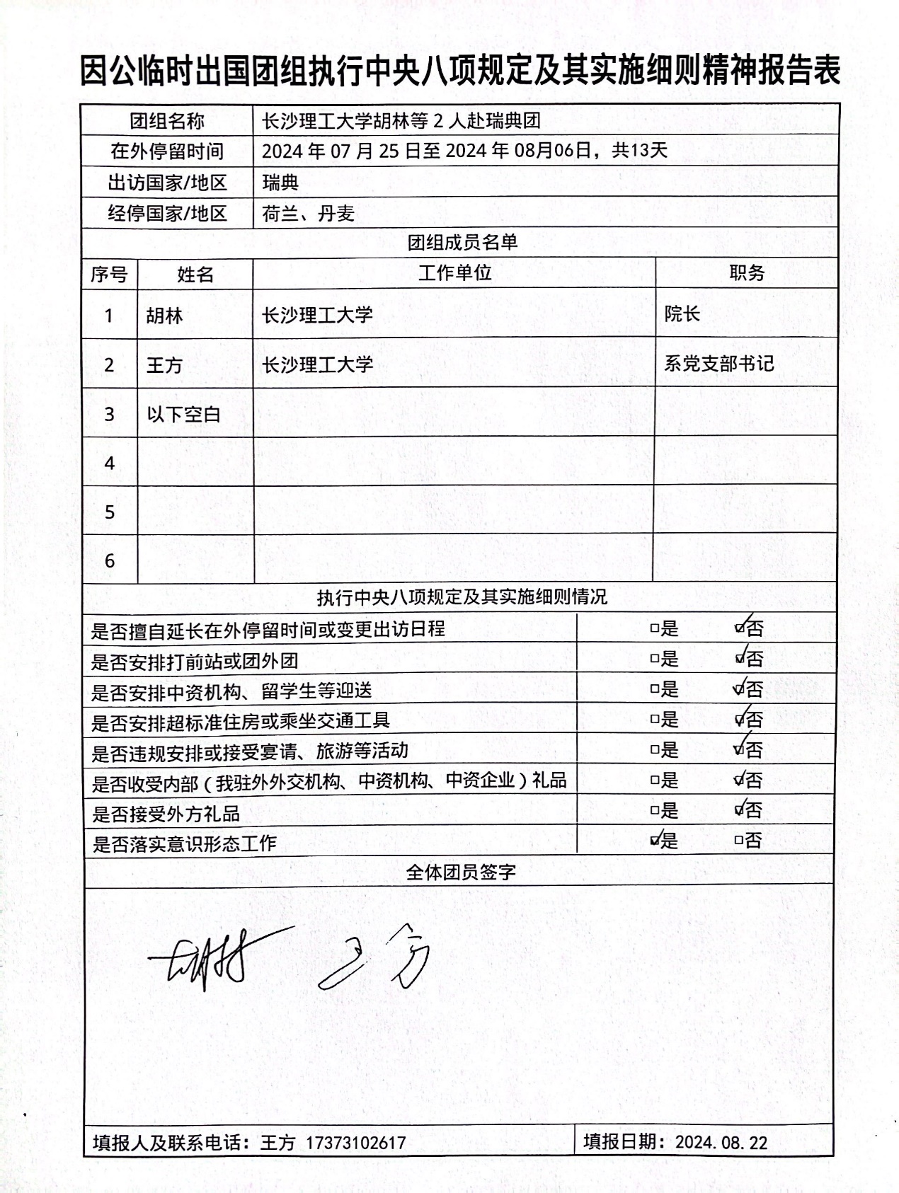三、《因公临时出国团组执行中央八项规定及其实施细则精神报告表》