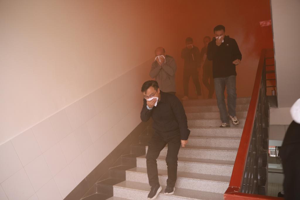 首先,刘教官在工一B417多功能会议室给全体师生讲解了利用毛巾逃生的注意事项及要求。当火灾警报声骤然响起后,全体师生立即反应,弯腰、左手用毛巾、口罩捂住口鼻,进行紧急疏散,有序从东西两头的楼梯口撤离到教学楼旁安全地段。整个逃生演练迅速、有序、安全,从听到警报声到师生全部撤离至安全地带共用时1分30秒,师生在亲身体验中增长了消防知识,学会了安全逃离火灾现场的方法。