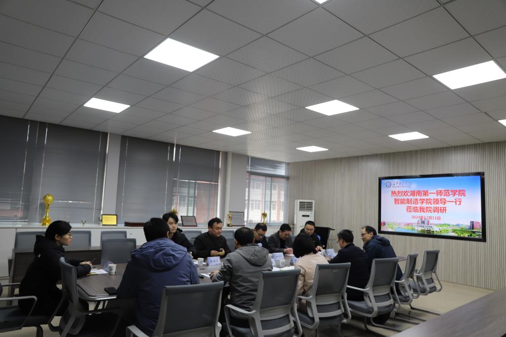 12月11日下午,湖南第一师范学院智能制造学院院长满君丰一行7人来我院开展交流调研。会议在工一B411会议室举行,学院党委书记孔伟红,副院长毛聪、胡宏伟、唐宏宾,智能制造系副主任兼党支部书记唐昆参加了调研座谈会,会议由唐宏宾主持。