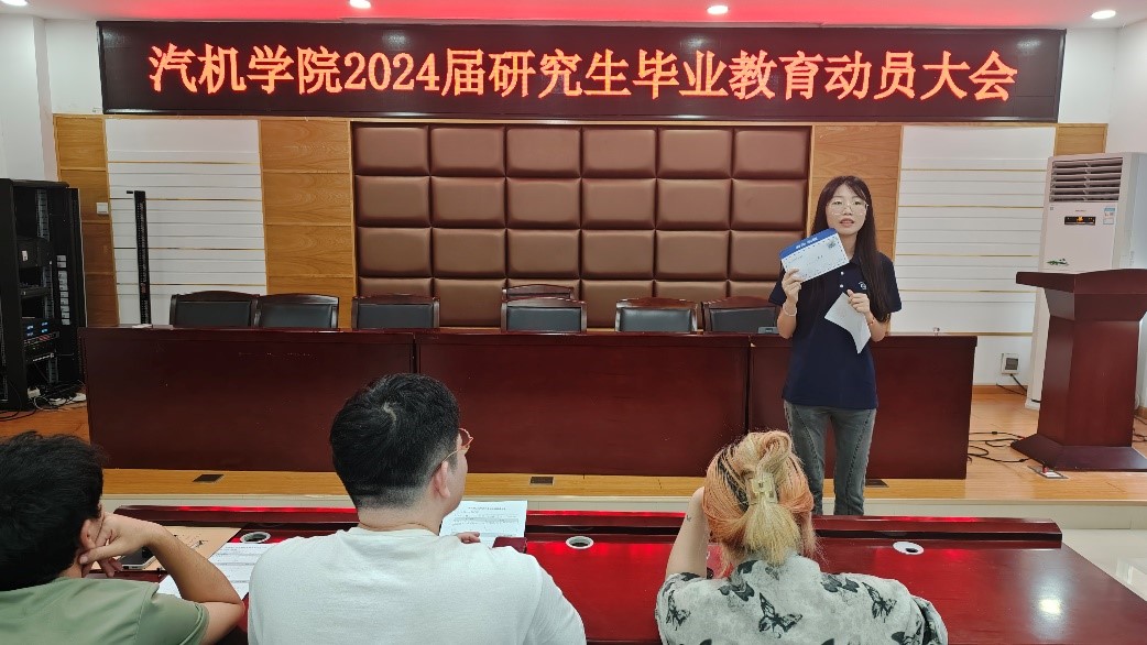 2024年6月18日9:00,汽机学院在云塘校区工科一号楼B417召开了2024届研究生毕业教育动员大会。本次会议由汽机学院辅导员万雨晴主持,汽机学院2024届研究生毕业生共计一百余人参加。