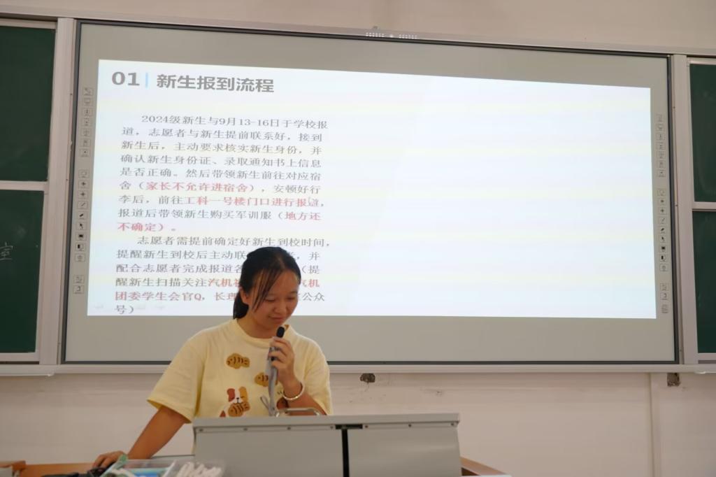 会议第一项由青志团袁丽华为参会人员详细讲解了迎新工作的各项注意事项。明确了迎新志愿者需熟练掌握各站点至学校的交通路线,以便为新生提供准确的导航服务。同时,她补充了迎新志愿者需清晰了解新生报到流程,确保在新生到校后能迅速、有序地协助其完成入学报到手续,并引导新生参与学习通志愿活动的打卡。此外,还特别提醒志愿者在带领新生熟悉校园时,要提醒新生警惕校园内的推销行为,以防上当受骗。