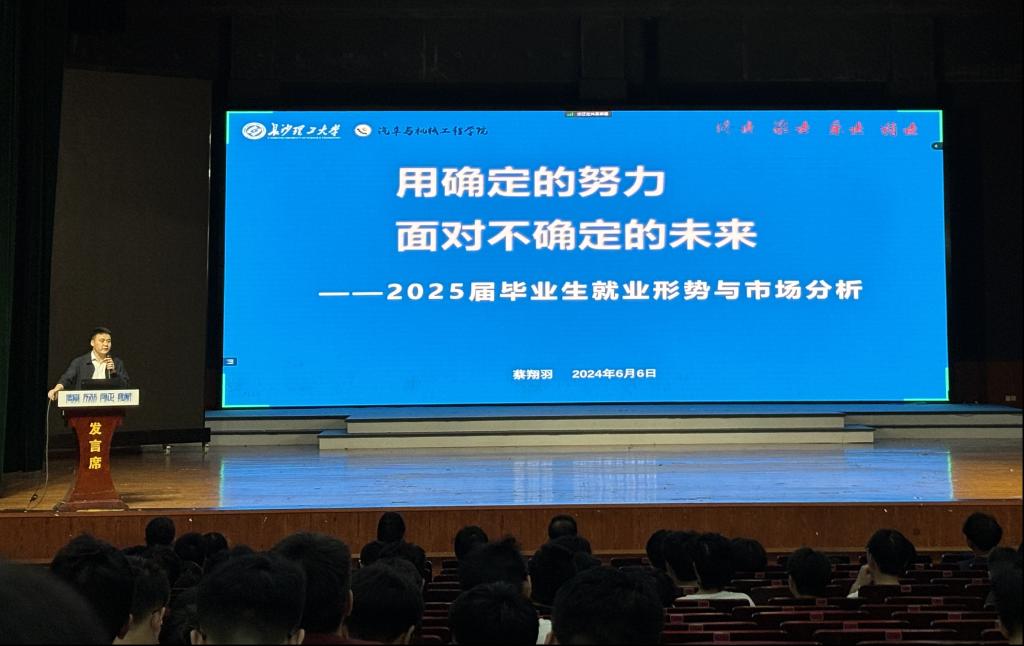2024年6月6日,汽机学院于云塘校区大会堂成功举行2025届毕业生就业动员大会,本次大会由2021级辅导员刘子硕老师主持,汽机学院党委副书记周小杰、2021级辅导员彭琼英、就业专干蔡翔羽与能动学院就业专干彭博出席,参与此次大会的还有2024届本科生代表祝浩天、2021届校友陈世冰以及2021级全体本科生。