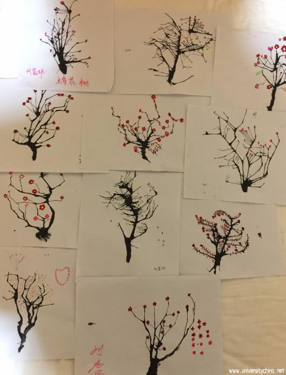 上课铃响起,孩子们立刻跑向教室。美术老师带大班的学生玩起了吹墨画。先滴几滴墨汁在白纸上,再用嘴或靠空笔筒吹气,将墨汁吹向不同的方向,发挥创造力和想象力,完成形态各异的枝干,最后上色点缀。很多学生们第一次接触,热情高涨。收完作品的美术老师一路向其他老师展示学生们的作品,笑得格外开心。有傲然梅花,有枯木逢春,抽出点点新绿。每一幅画都各有千秋。
