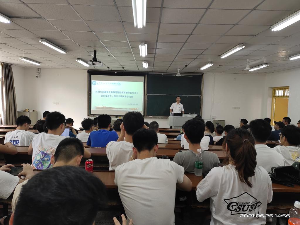 2021年6月26日下午,湖南五新隧道智能装备股份有限公司研究院院长管付如高工应邀来我院开展主题为“长大隧道施工成套智能装备”的机械类企业课程教学。本次教学由汽机学院副院长毛聪教授主持,2020级机械类专业硕士研究生参加了此次教学。