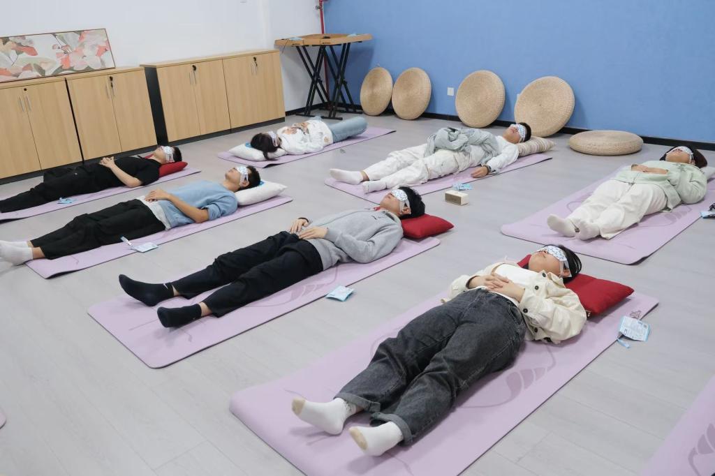 理论的探索之后,是身体的放松与心灵的沉淀。杨老师带领大家移步至瑜伽室,在轻柔的引导下进行瑜伽拉伸与深度放松训练。伴随着舒缓的音乐,同学们戴上眼罩,进行了约6-8分钟的短暂冥想休憩,让此前活跃的思维慢慢沉静,使身心达到和谐统一的状态。最后,大家亲手配制助眠香包,在香包上绘制喜欢的图案、书写心仪的文字,将活动中的感悟与美好期许寄托其中。