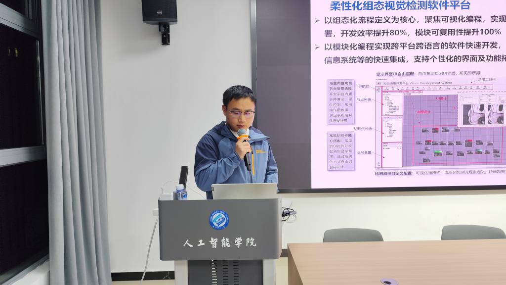 2025年11月26日晚,我院AI前沿论坛第六期专题讲座——“工业智能视觉检测”在A201报告厅举行。学院工业控制系青年博士教师胡钊川受邀主讲,百余名学生代表参与。