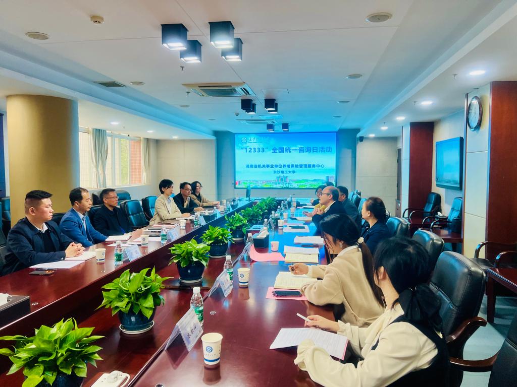 董端汇报了学校关于湖南省机关事业单位养老保险参保和养老待遇领取的情况。湖南省机关事保中心对学校养老保险业务面临的问题逐一解答,双方重点讨论了调入人员参保、保费征缴、退休审批与待遇领取、职业年金记实或补记、养老待遇新老办法核定衔接等问题。此外,双方还对养老待遇资格认证、待遇暂停等情况进行了深入沟通。