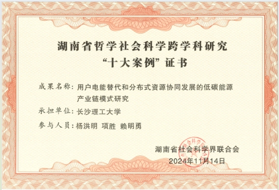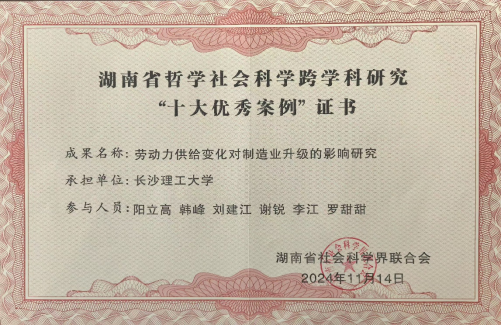 近日,湖南省社会科学界联合会公布了湖南省哲学社会科学跨学科研究“十大优秀案例”和“十大案例”名单,XK星空阳立高教授的研究成果《劳动力供给变化对制造业升级的影响研究》和杨洪明教授的研究成果《用户电能替代和分布式资源协同发展的低碳能源产业链模式研究》分别荣获湖南省哲学社会科学跨学科研究“十大优秀案例”和“十大案例”。