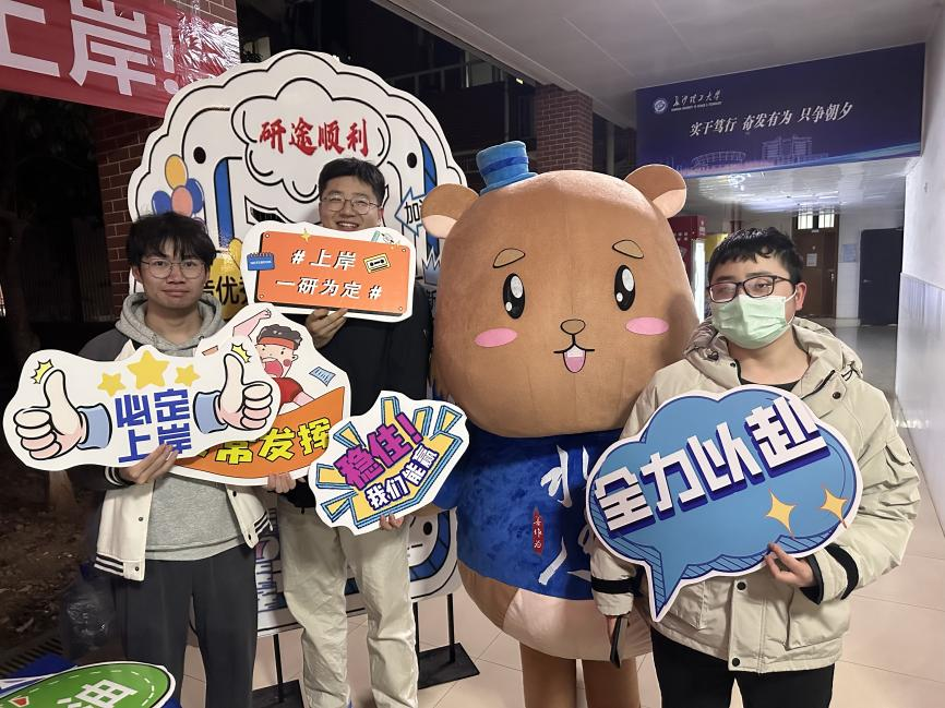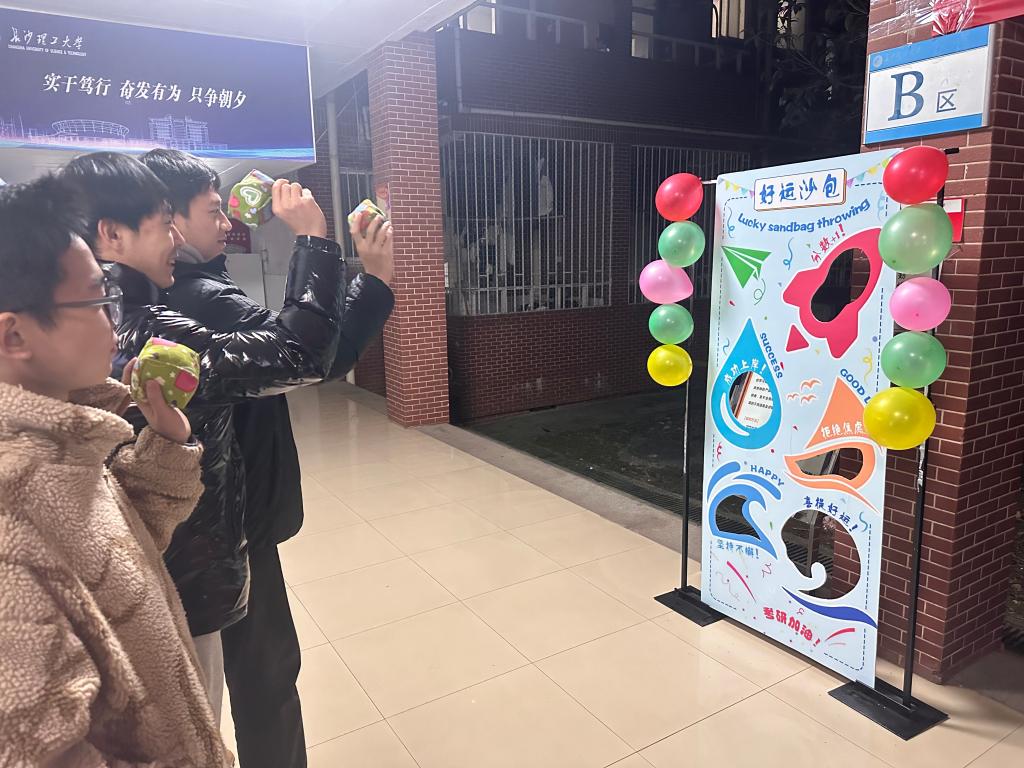 活动现场还进行了幸运大转盘抽奖、好运沙包投掷、水狸玩偶“爱”的抱抱、研途顺利打卡等活动,帮助考研学子舒缓备考压力,激发考前动力,助力研考最后一公里。“乾坤未定,你我皆是黑马!”“分数+1,未来可期”,宿舍楼内考研学子的愿望语以及祝福语布满了留言墙,将一句句温暖的话语传递到每一位考研学子的心间。