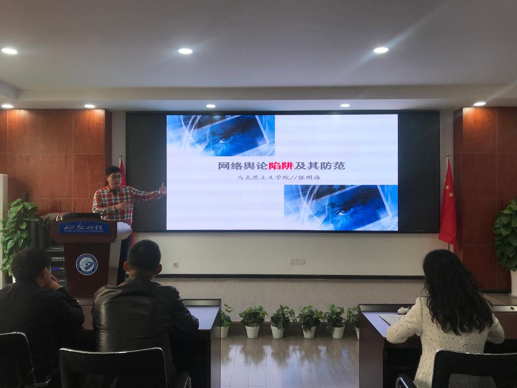 10月23日下午,水利工程学院在云塘校区工三B319组织全体教职工开展宣传思想和意识形态工作专题学习活动。活动特别邀请马克思主义学院副院长张明海作《网络舆论陷阱及其应对策略》专题讲座,由院党委书记喻玲娜主持会议。