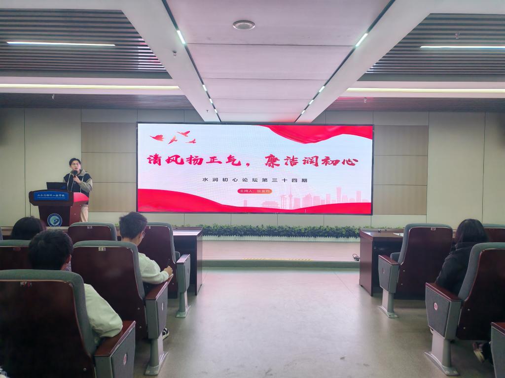11月20日晚,水利学院在新能源一栋二楼会议室举办第三十四期“水润初心”学习论坛,本期论坛主题为“清风扬正气,廉洁润初心”。活动由本科生第一党支部张富翔同志主持,共计60余名学生参与。