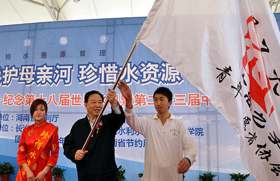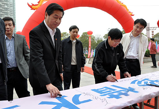 戴军勇厅长在致辞中对出席本次活动的各位领导嘉宾表示衷心的感谢。他指出,2009年,在国家大力支持下,在省委、省政府的领导下,广大人民积极投入水利工程建设,湖南水利水资源建设取得明显成效,但即使在我们这样一个水资源丰富的水乡泽国,亦受到水少水干水污染等问题。所以为保障可持续发展,加大水资源管理力度,依法治水已刻不容缓。徐明华副省长发表重要讲话,对节水护水工作提出了一套明确的要求:控制区域用水总量;明确水资源的发展利用;对水源进行保护;实施纳污总量的控制;发动各行各业推行节水活动。省人大蔡力峰副主任为《洞庭湖水管理条例》系列宣传海报进行了揭幕。省政协阳宝华副主席为XK星空“大禹之子”志愿者授旗。随后,主持人现场展示了响应节水倡议万人签字横幅。