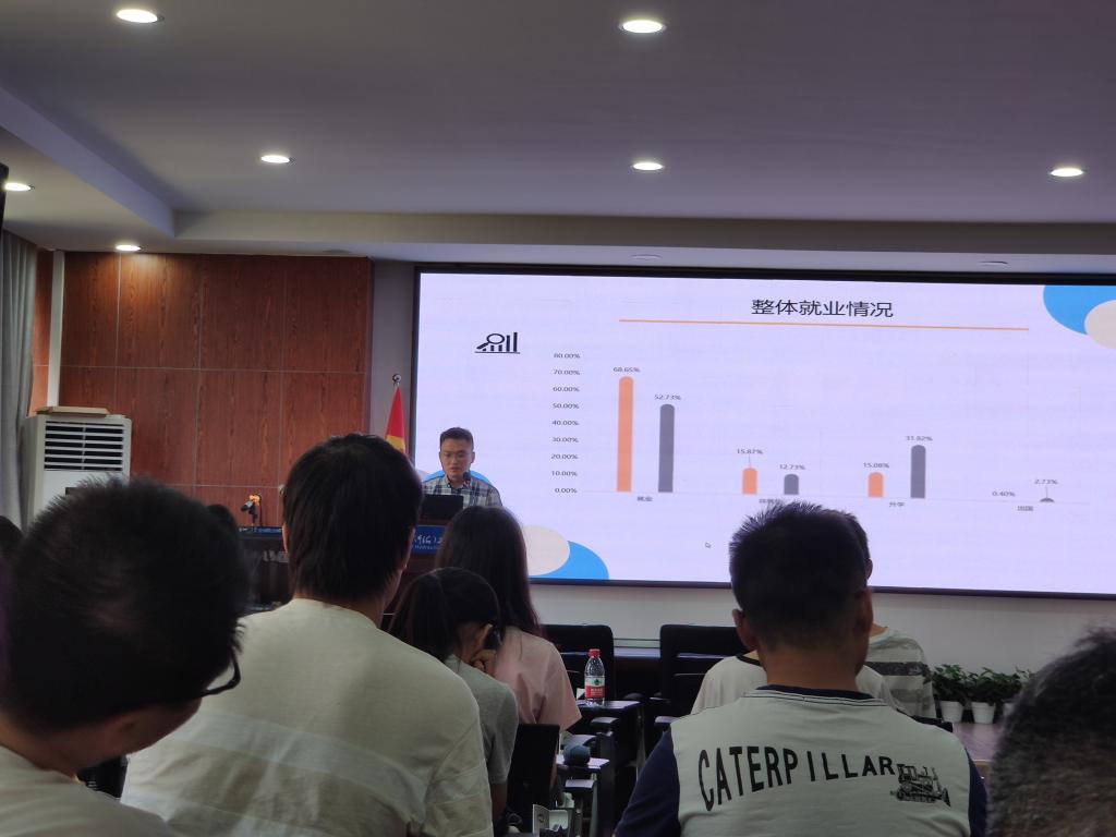 会上,王书记对大家的到来表示感谢,随后给大家展示了19届毕业生的整体情况,分别从就业、待就业、升学、出国等几个方面向大家着重介绍了我院对毕业生的关注度,随后向大家展示了男女毕业生去向的情况,提到女生在工科专业就业普遍不占优势的情况的时候,王学成表示女生成绩普遍较好,可以多往考研和设计院的方向发展。会议尾声之时,王学成再次提到学院对毕业生去向情况的关心,并表示没有签工作的同学不要着急,签了工作的同学也不要太松懈,对自己应该有更高的要求,在已经签了的工作情况下再去尝试无压力考研,也是一个不错的选择。