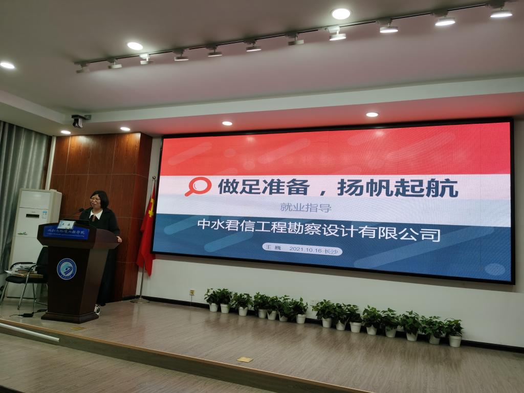 10月16日下午,水利与环境工程学院在工三B319举办职业与人生大讲堂之就业指导报告会,邀请中水君信工程勘察设计有限公司总经理助理王巍作专题报告,学院2018、2019、2020级100余名学生参加,就业辅导员李永睿主持会议。