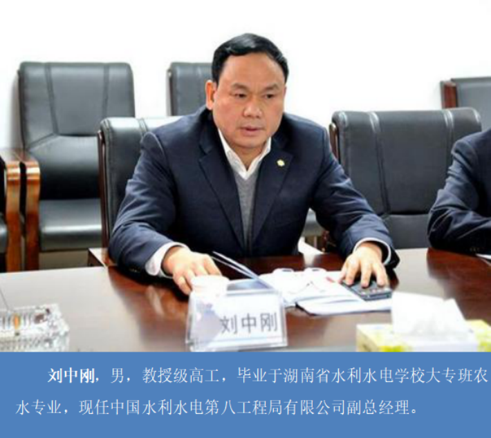 刘中刚,男,教授级高工,毕业于湖南省水利水电学校大专班农水专业,现任中国水利水电第八工程局有限公司副总经理。