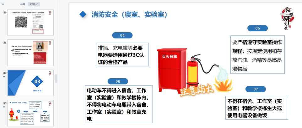 会上,胡佳佳对全体新生加入食品学院这个大家庭表示热烈的欢迎,介绍了本届研究生基本情况,然后结合实际生活和学习中的案例,从人身安全、财产安全、消防安全等六个方面开展安全教育培训。她指出,电信诈骗防不胜防,呼吁大家下载安装国家反诈中心APP,提高个人防诈骗意识和能力。她还强调了要自觉遵守学生宿舍、工作室(实验室)安全管理规定,不私接乱搭电线、网线,不得使用大功率用电器(如电热毯、电热杯、热得快、取暖器、电饭锅、电吹风等),以免引发火灾。