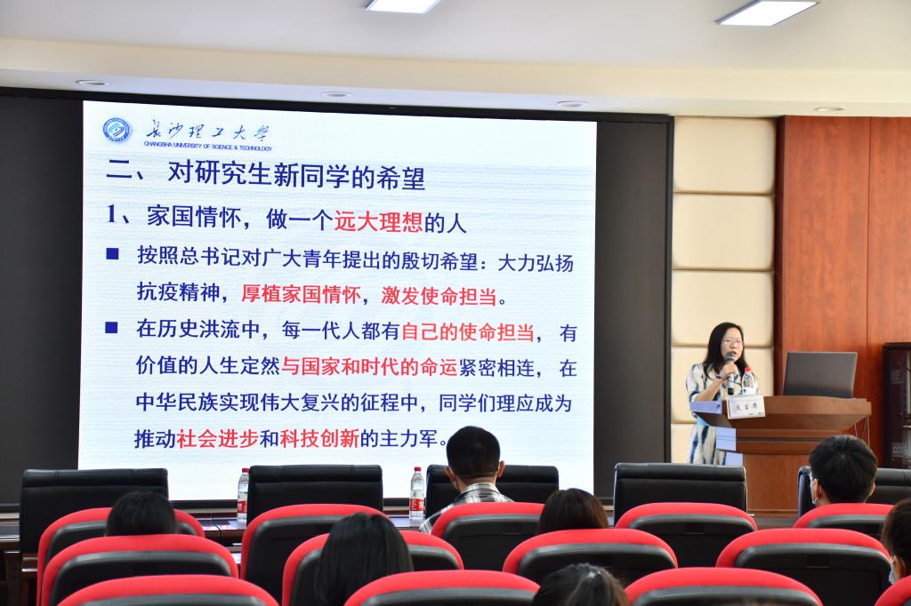 课堂上,程云辉提出了四点希望:一是,希望研究生具有家国情怀,做一个理想远大的人;二是,希望研究生潜心笃学,做一个学识广博精深的人;三是,希望研究生治学严谨,做一个恪守学术道德的人;四是,希望研究生有情有趣,做一个热爱生活的人。她认为,扣好人生的第一粒扣子,就是要端正志向,树立家国情怀。在科研过程中,要善于打破惯性思维,大胆突破,不断创新。她希望同学们将实现自己人生目标与价值的“个人梦”融入国家民族的共同的“中国梦”和全体师生建设百强大学的“长理梦”之中。