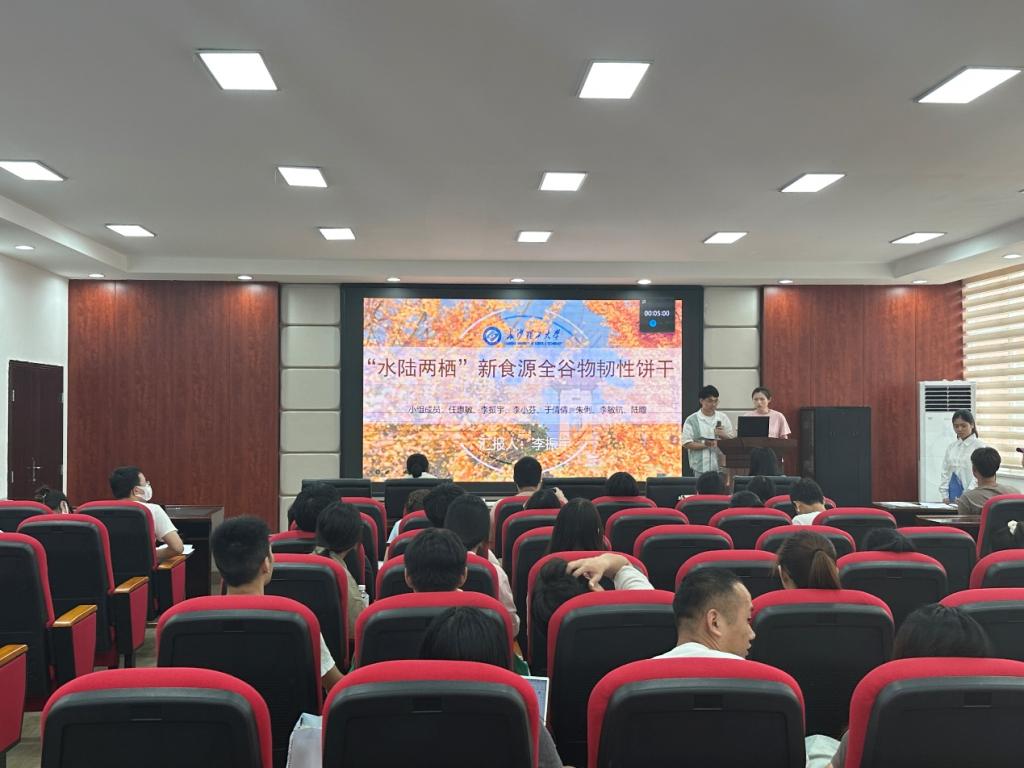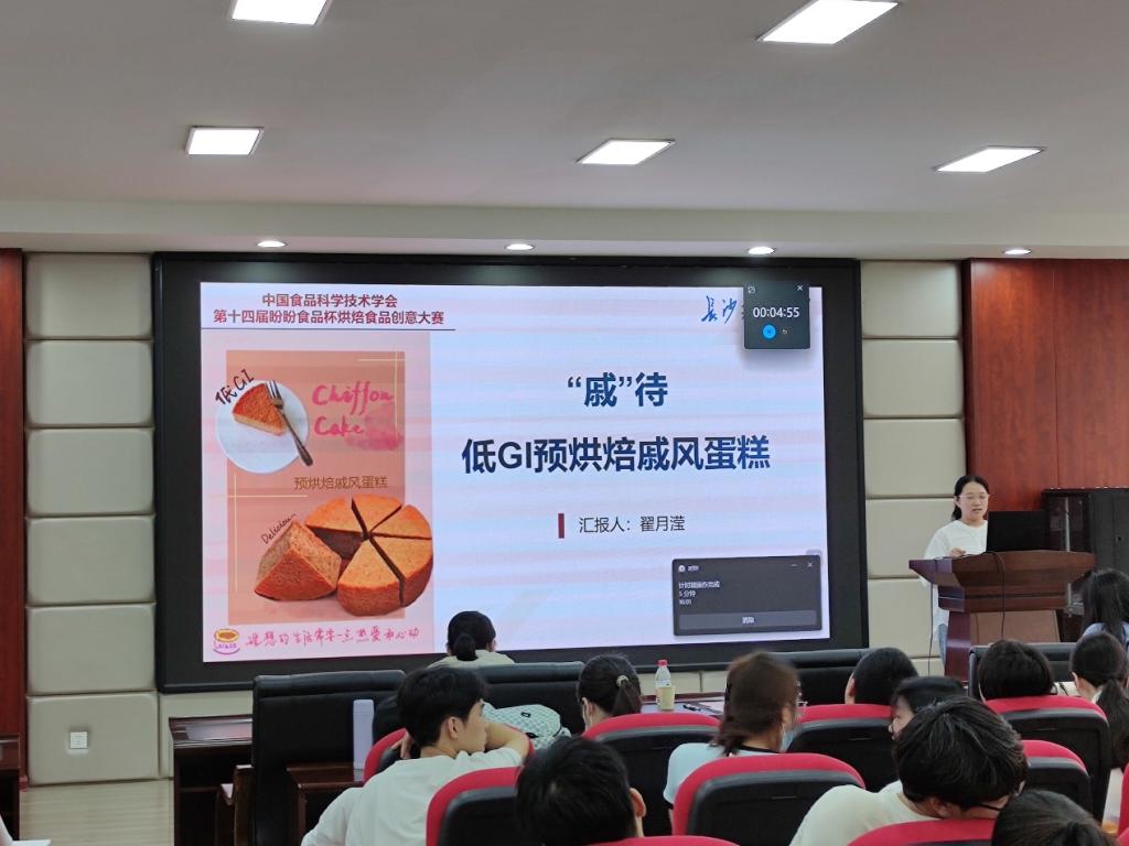 决赛现场,研究生各参赛队伍充分展现了其创意和动手能力,“荞首盼君归”项目策划添加富含芦丁、谷胱甘肽和硒等功能因子的苦荞及具有消炎、降血糖保健价值的斑斓叶,制作出用烘烤代替油炸酥软香甜的麻花,产品完善具体,健康有新意;“Wait-低GI预烘焙戚风蛋糕”项目通过添加低GI原料、抗冻肽,采用低温等离子灭菌技术,在保证口感和外观的同时,赋予其方便性与健康,具有平衡血糖、便捷易储存等优点;“合”你心意“芸”朵面包——全麦懒人面包项目是一款以全麦粉与白芸豆提取物相结合,通过添加湖南特产龙牙百合、壳聚糖等原辅料,制成的新型云朵状面包,在抑制人体脂肪吸收的同时促进脂肪排出,具有健康、饱腹、美味、懒人代餐的理念……最后校级决赛选拔出10支队伍进入国赛,其中包括5支研究生队伍。