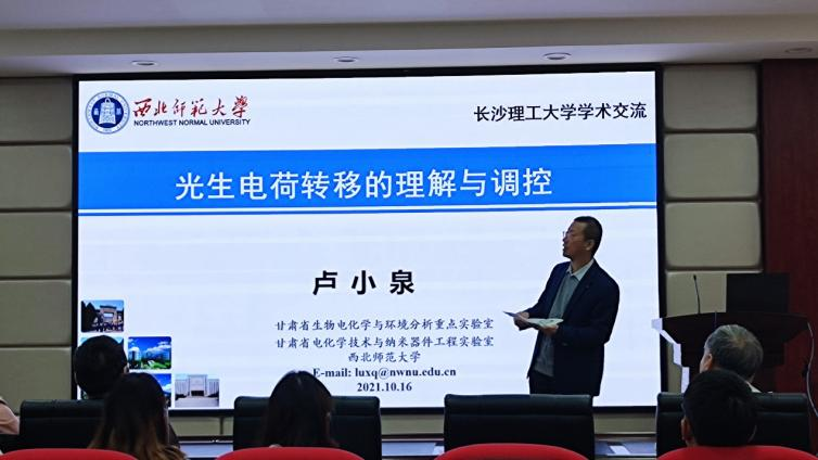 2021年10月16日上午9:00,应XK星空化学化工学院的邀请,教育部长江学者特聘教授、西北师范大学博士生导师卢小泉教授来我校开展学术交流,于云塘校区工三A320做了题为“光生电荷转移的理解与调控”的专题学术报告。讲座由化学化工学院电力与交通材料保护湖南省重点实验室主任曹忠教授主持,化学化工等专业百余名师生参加了交流会。