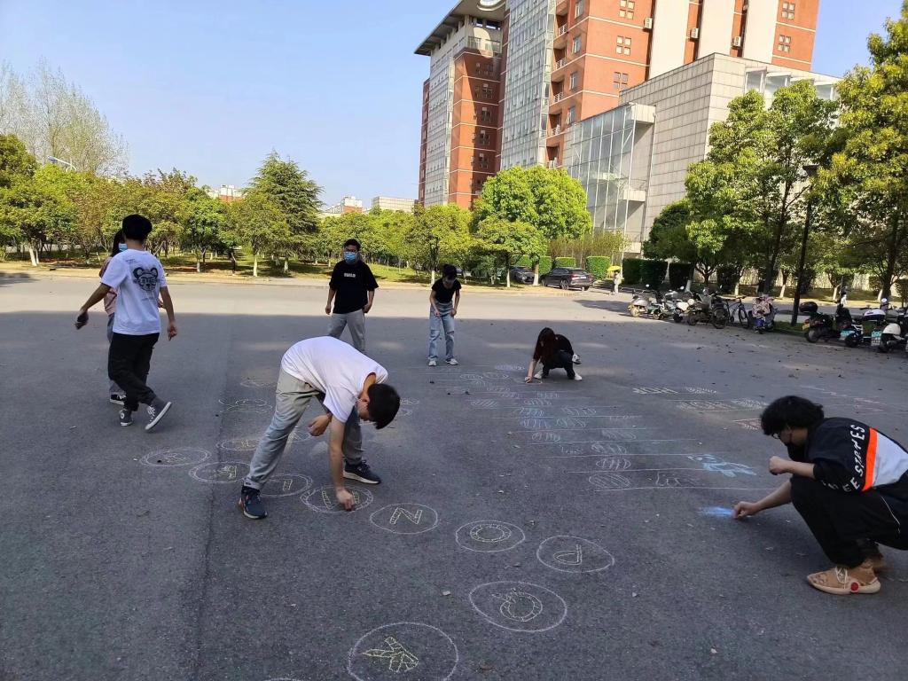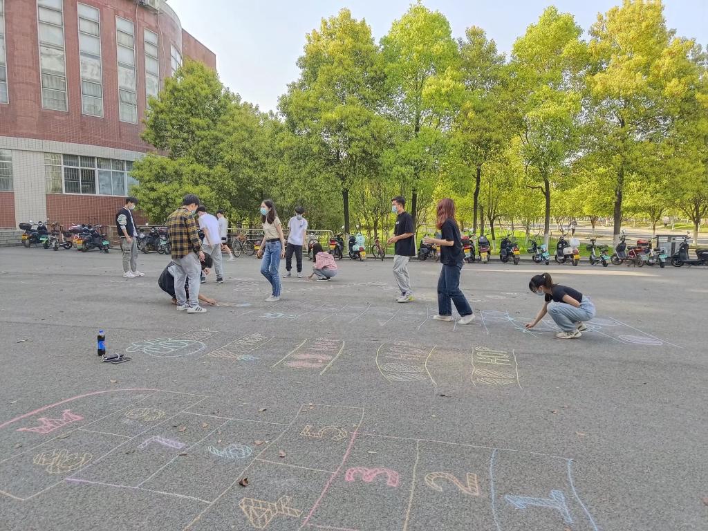 此次活动以学生宿舍为单位,采取小团体、不聚集的方式开展,学院学生干部以工三前坪为活动场地,用彩色粉笔画就各类“基础版”、“升级版”儿时游戏“跳房子”,并配以各类卡通图案,提供给学院学生作为游戏空间,鼓励学院学生以宿舍等为单位积极参与,帮助在校学生舒缓压力。