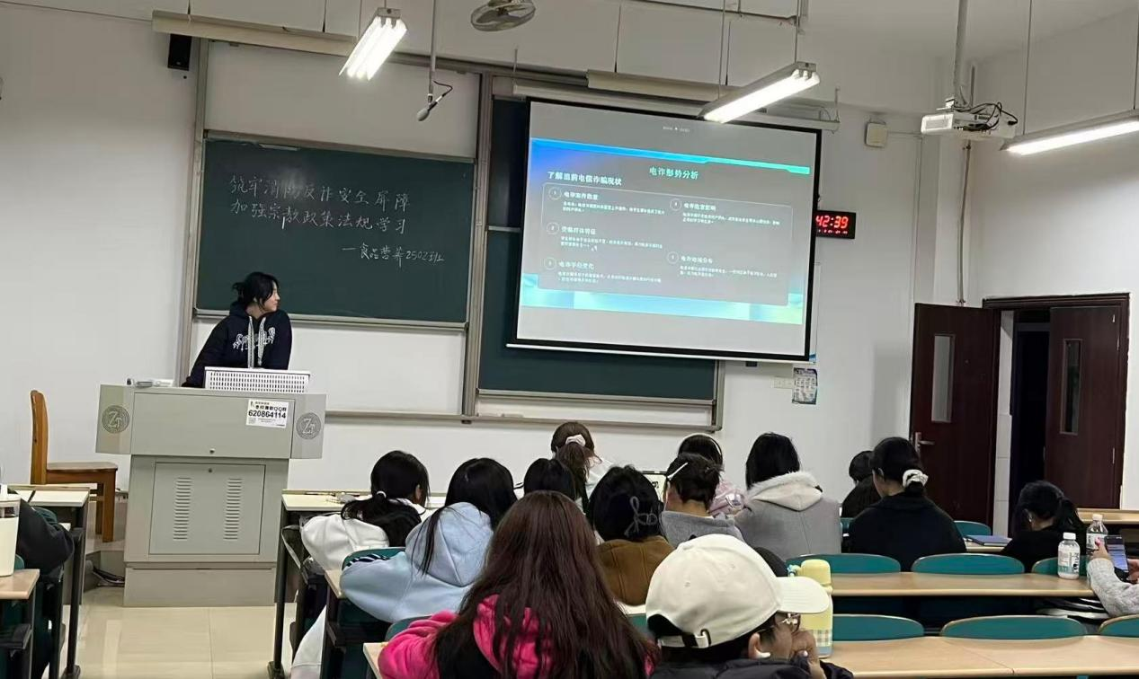 班会期间,各班班长紧扣主题,牵头组织同学们系统学习消防安全、防范诈骗及宗教政策法规等核心内容。通过集中播放《主题消防安全教育片》、深度剖析真实火灾案例,重点讲解宿舍与实验室用电规范、火场逃生自救等实用技能,强化同学们的安全防范底线思维;在防范诈骗板块,结合近期高发的电信网络诈骗典型案例,深入拆解虚假购物退款、冒充熟人借钱等常见诈骗手法,引导同学们牢记“不轻信、不转账、多核实”的反诈准则,筑牢财产安全防线;同时,通过解读国家宗教政策法规、分享相关典型案例,帮助同学们明确合法宗教活动与非法宗教渗透的界限,进一步增强法律意识与辨别能力,自觉抵制非法宗教活动。