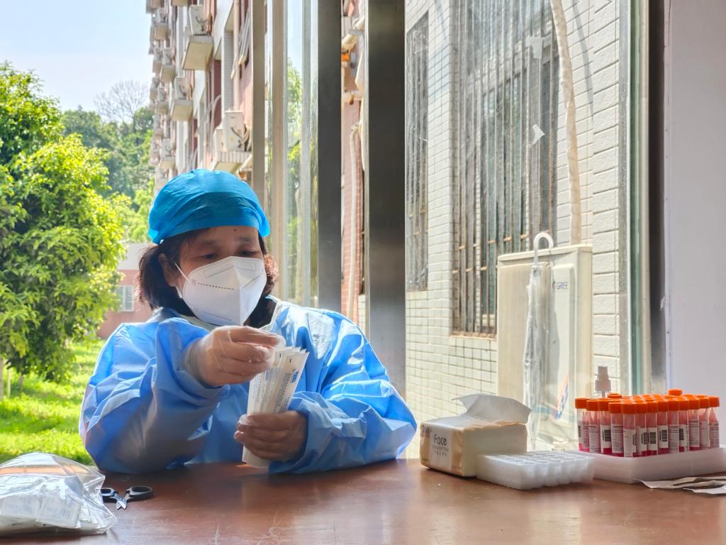 图3 盛灿梅老师在学生宿舍参加核酸检测志愿者工作