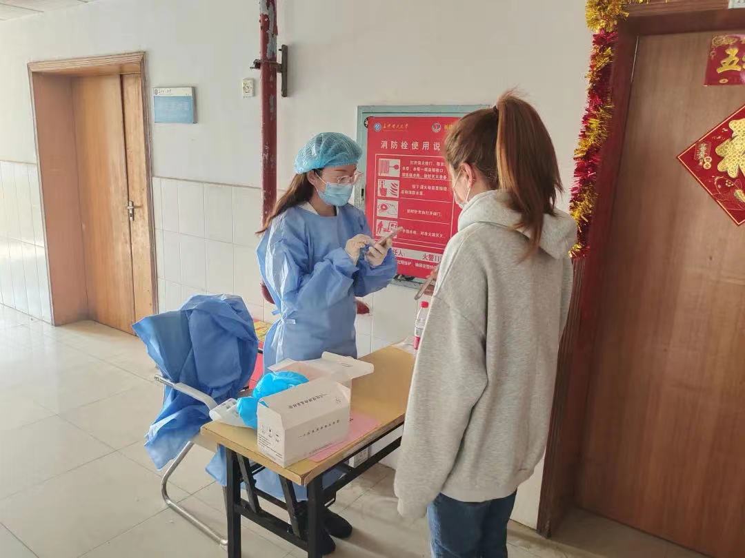 图4 刘艳兰老师在学生宿舍参加核酸检测志愿者工作