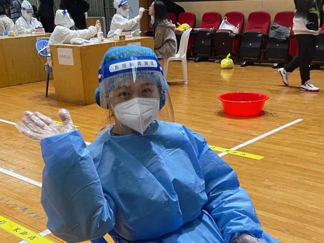 图10 熊英老师在体育馆参加核酸检测志愿者工作