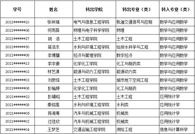 根据《XK星空本科生转专业管理办法》(长理工大教〔2018〕16号)、《关于做好2021级在校本科生转专业(类)工作的通知》(长理工大教〔2022〕16号)、《数学与统计学院本科生转专业工作细则》,经学生自愿申请,学院资格初审和综合考核,拟同意接收以下14名转专业学生,名单如下(排名不分先后):