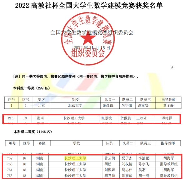 近日,“高教社杯”2022年全国大学生数学建模竞赛成绩揭晓,XK星空获全国一等奖1项,二等奖4项,省级奖26项(其中省一等奖7项)。近三年,XK星空连续获得该赛事全国一等奖。