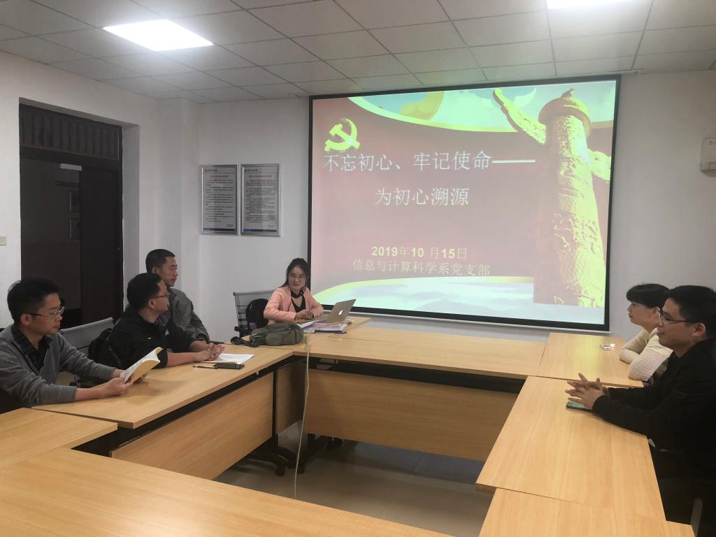 10月15日下午,信息与计算科学系党支部书记李姣在党员活动室理科楼A502给本支部党员讲了题为“不忘初心、牢记使命——为初心溯源”的主题党课。