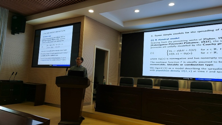 2024年10月23日下午,澳大利亚科学院院士、新英格兰大学教授杜一宏受邀为我院师生作了一场题为“A free boundary model for super invaders”的学术报告。出席此次报告会的有数学与统计学院党委书记邓崛峰、副院长李景、胡海军、李姣等领导。报告会由副院长李景主持,吸引了近两百名学院师生参加。