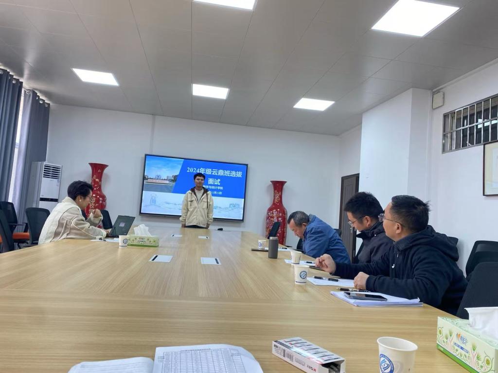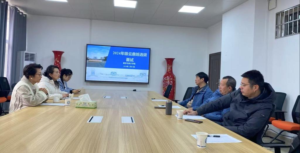 12月22日上午,数学与统计学院在理科楼A410会议室举行2024级数学云鼎班招生选拔面试,会议由学院分管拔尖人才培养工作的王芳主持,副院长李景、李姣、胡海军等专家评委参加会议。学院首先对2024级申请数学云鼎班的申请表进行审核,综合考虑数学分析、高等代数期中考试成绩和附加分成绩,推选出30位学生进入选拔面试。