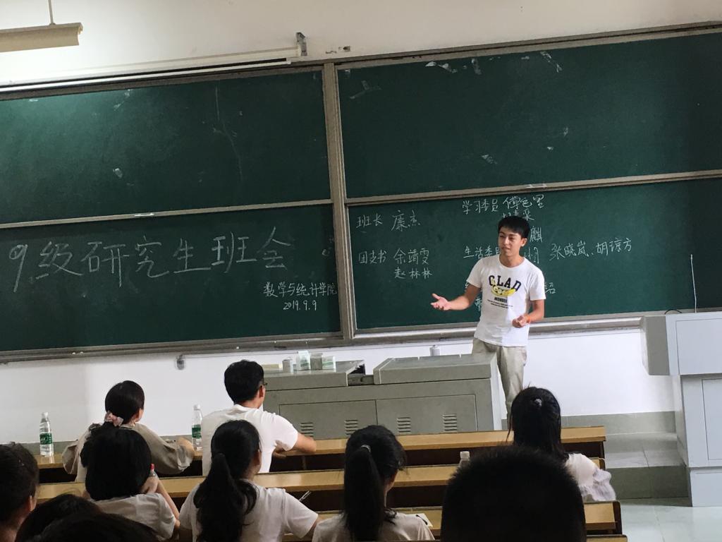 为了加强新生的交流与联系,营造良好和谐的校园氛围。9月9日上午,数学与统计学院2019级研究生新生班会在金盆岭校区1A-406举行,党委副书记马丽、研究生辅导员杨爽、院研会全体成员以及19级所有新生均参加了本次班会,本次班会由院研究生会主席彭点江主持。