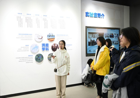 在水利与环境工程学院,长沙同升湖高级中学的师生们参观了洞庭湖水环境治理与生态修复湖南省重点实验室。在实验室展厅,志愿者曹丽娇围绕锻造四种力量,服务国家战略,高等级航道工程建设及关键技术、陆海新通道建设关键技术、港口工程建设关键技术等方面进行介绍并以“扎根一江一湖四水”为主题,为同学们讲解了水利学科如何服务国家基础设施建设以及破解水利工程重大难题。同时与会老师还就水环境治理的科学原理与技术路径与同学们进行了探讨,并赠送了文创礼品。