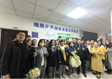 步入化学化工学院,长沙同升湖高级中学的师生们参观了化学化工学院细胞化学湖南省重点实验室。学院党委副书记李家春、实验室负责人周怡波就实验室的设备,实验室的各项设施以及实验室取得的成就进行了讲解,轻松幽默的话语让同学们对重点实验室有了一个更深刻的了解,并且对这个充满着奇妙的科学研究及浓郁的学术氛围的地方心生向往,让大家对自己的人生道路有了新的规划与选择。