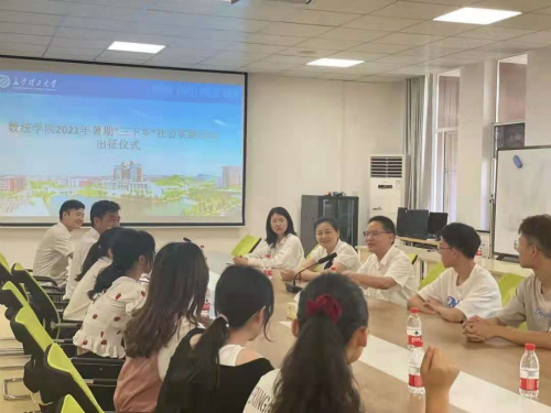 2021年7月12日下午,在云塘校区理科楼A212召开了2021年暑期 “三下乡”社会实践活动出征仪式。院党委书记邓崛峰、党委副书记马丽出席,团委书记柳映堂、学工办主任庄奕、心理辅导员杨爽、就业专干崔培东以及参与“三下乡”社会实践活动的学生团队代表加此次出征仪式。