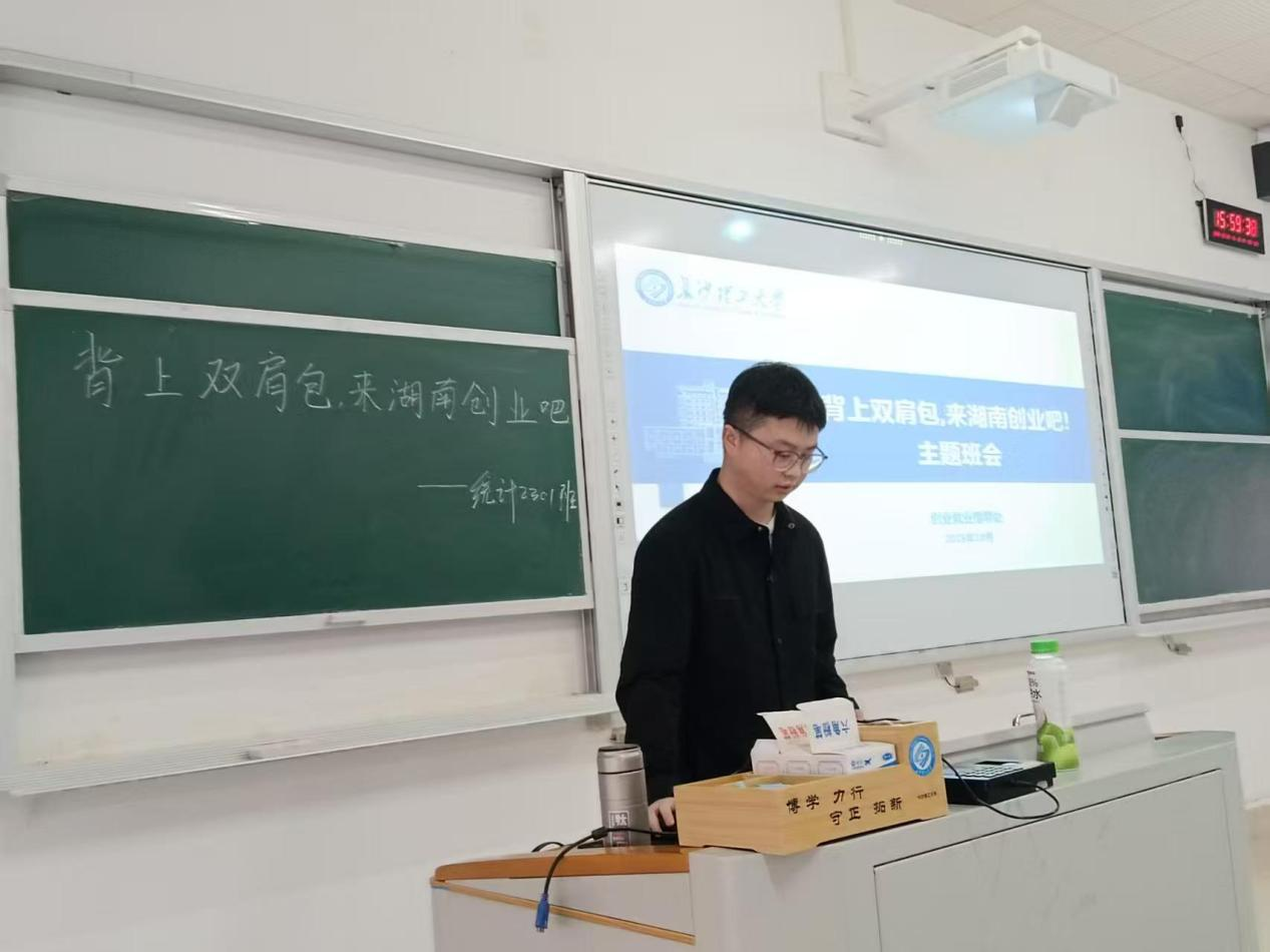 为深入贯彻《湖南省大力支持大学生创业若干政策措施》等文件精神,进一步激发大学生创新创业热情,推动创业教育深度融入人才培养全过程,培养更多具备创新精神与实践能力的高素质人才,自2025年10月23日起,我院各班级陆续组织召开了以“背上双肩包,来湖南创业吧!”为主题的班会活动。班会由各班创新创业委员主持,全体同学积极参与。