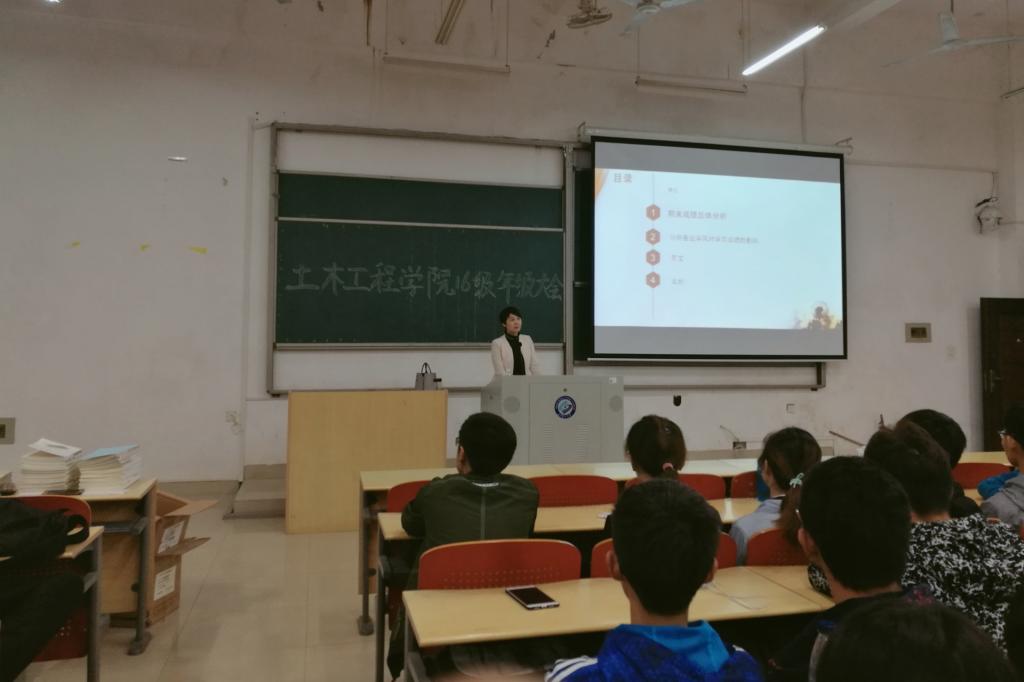 10月16日晚,土木工程学院在工科一号楼召开了2016级年级大会。16级辅导员贺佐杰老师对上一学期2016级不同专业的班级考试成绩及学风情况进行详细分析,总结各班级成绩差距的原因,提出对新学期学习生活的建议要求。16级全体学生参加会议。