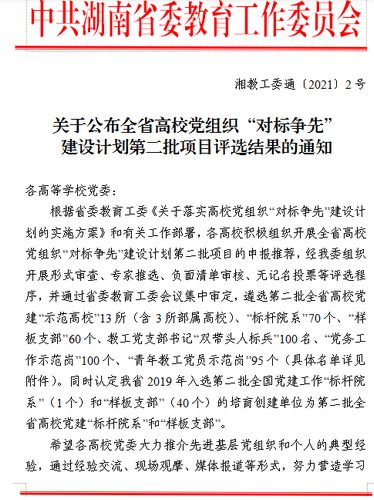 本次评选是湖南省教育工委《关于落实高校党组织“对标争先”建设计划的实施方案》中系列工作之一。经高校申报,省教育工委形式审查、专家推选、负面清单审核、无记名投票等评选程序,并通过省委教育工委会议集中审定,遴选第二批全省高校党建“示范高校”13所(含3所部属高校)、“标杆院系”70个、“样板支部”60个、教工党支部书记“双带头人标兵”100名、“党务工作示范岗”100个、“青年教工党员示范岗”95个。同时认定我省2019年入选第二批全国党建工作“标杆院系”(1个)和“样板支部”(40个)的培育创建单位为第二批全省高校党建“标杆院系”和“样板支部”。